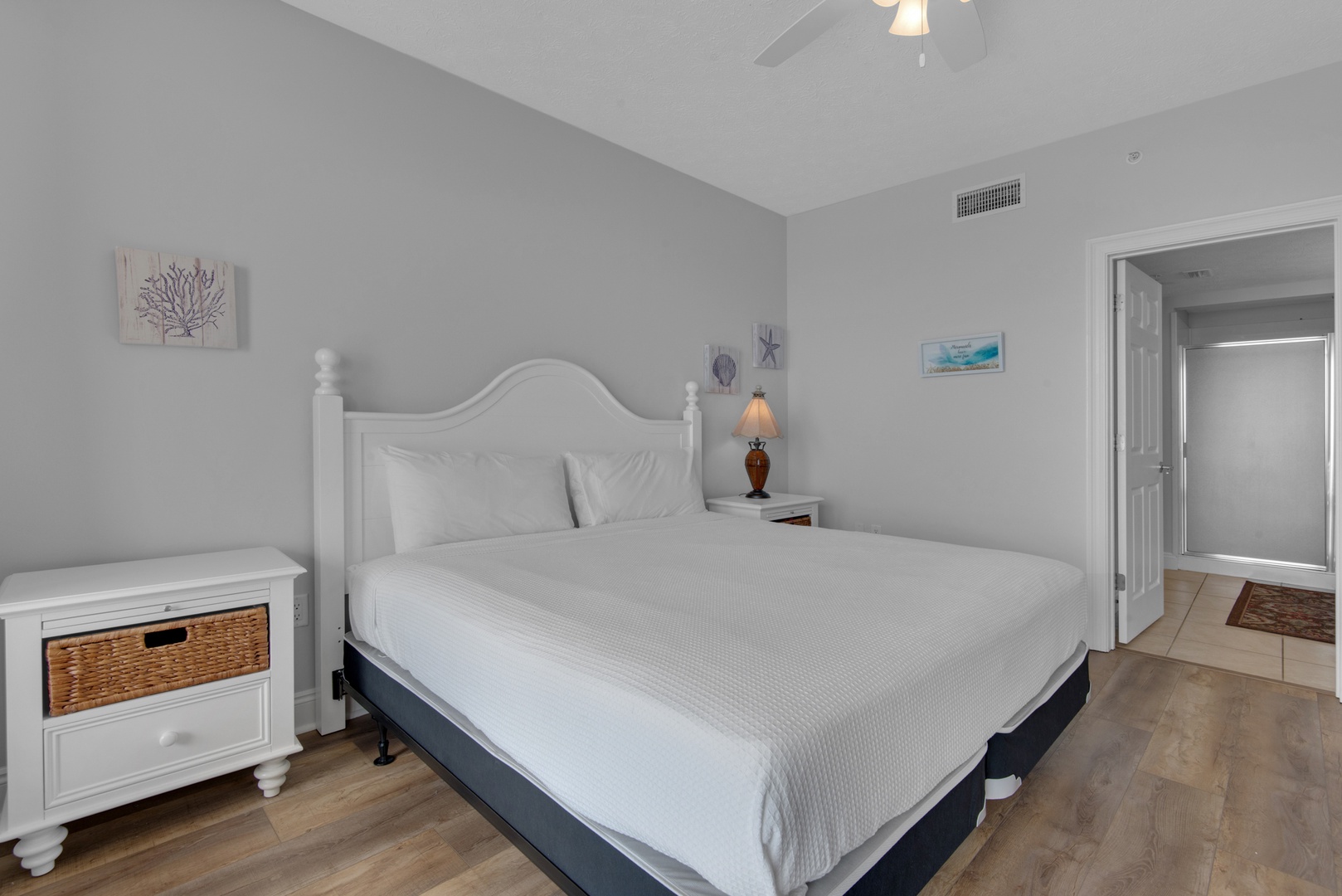 • Gulf front main king bedroom steps out to oversized balcony; private ensuite bathroom and walk-in closet