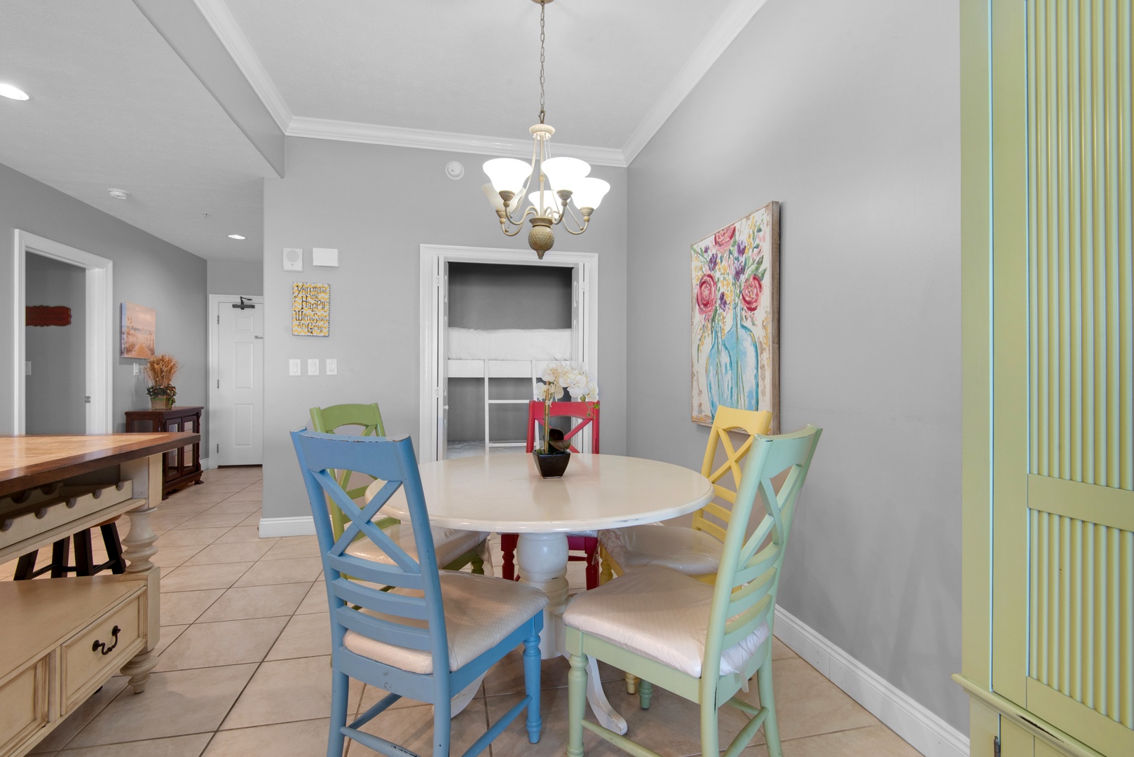 It’s a 1,370 sq. ft. space with 2 bedrooms, 2 baths and bunk beds and a queen sleeper sofa – sleeping eight comfortably. The main bedroom has a king-sized bed, balcony access, ensuite bathroom and walk-in closet. The second bedroom has a queen-sized bed, plus there are clever bunkies off the dining area that each are single mattresses. Bunkies are a popular choice for kids and teens.