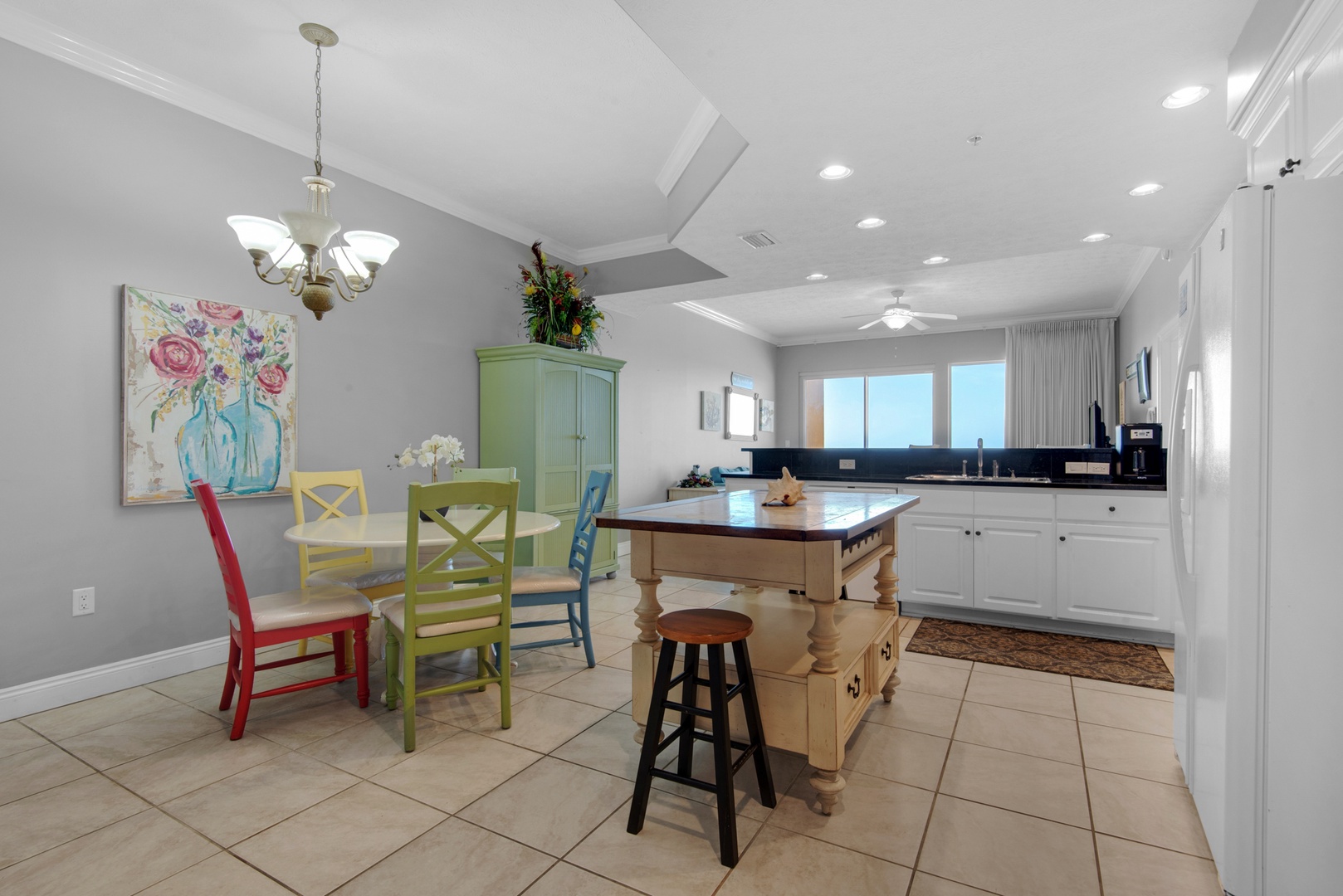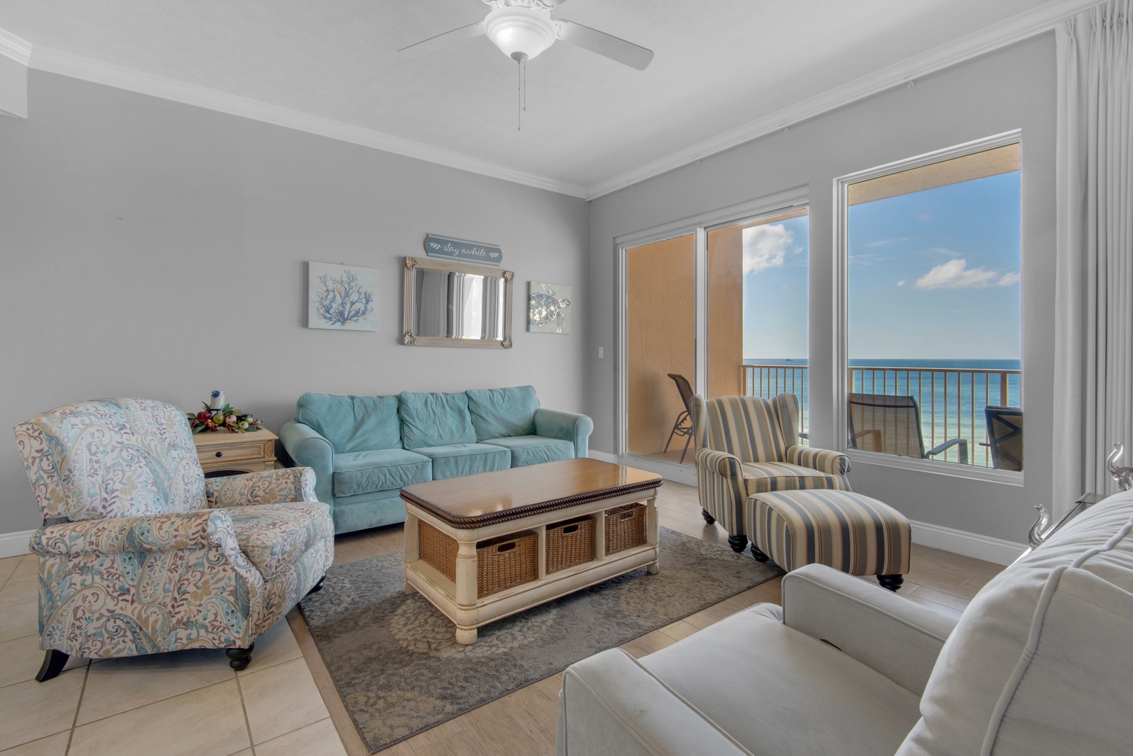 It’s wonderfully situated on the West side of the resort overlooking the pool deck and the expanse of the ocean and views down ten miles of Panama City Beach. You’ll hear the gentle sound of the ocean as your backdrop from inside or on your private balcony.