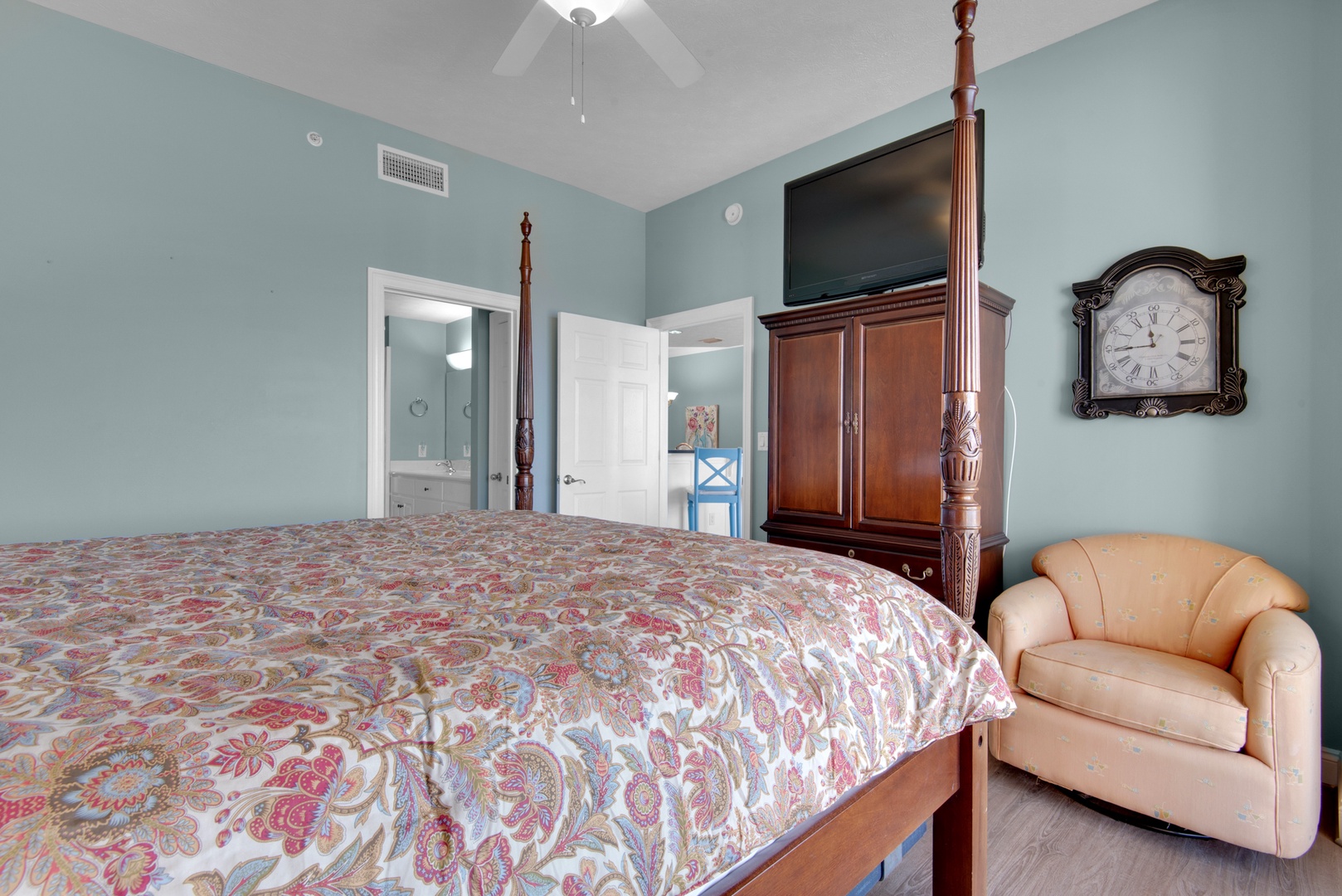 • Gulf front main king bedroom steps out to oversized balcony; has a private ensuite bathroom and walk-in closet