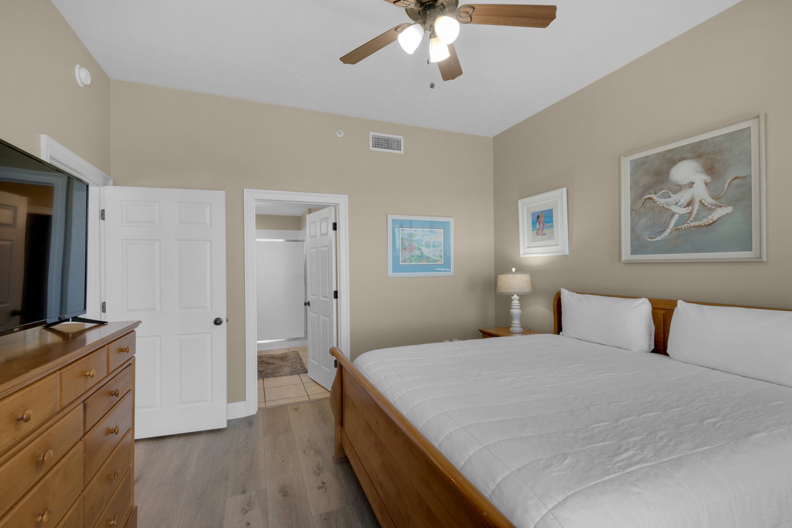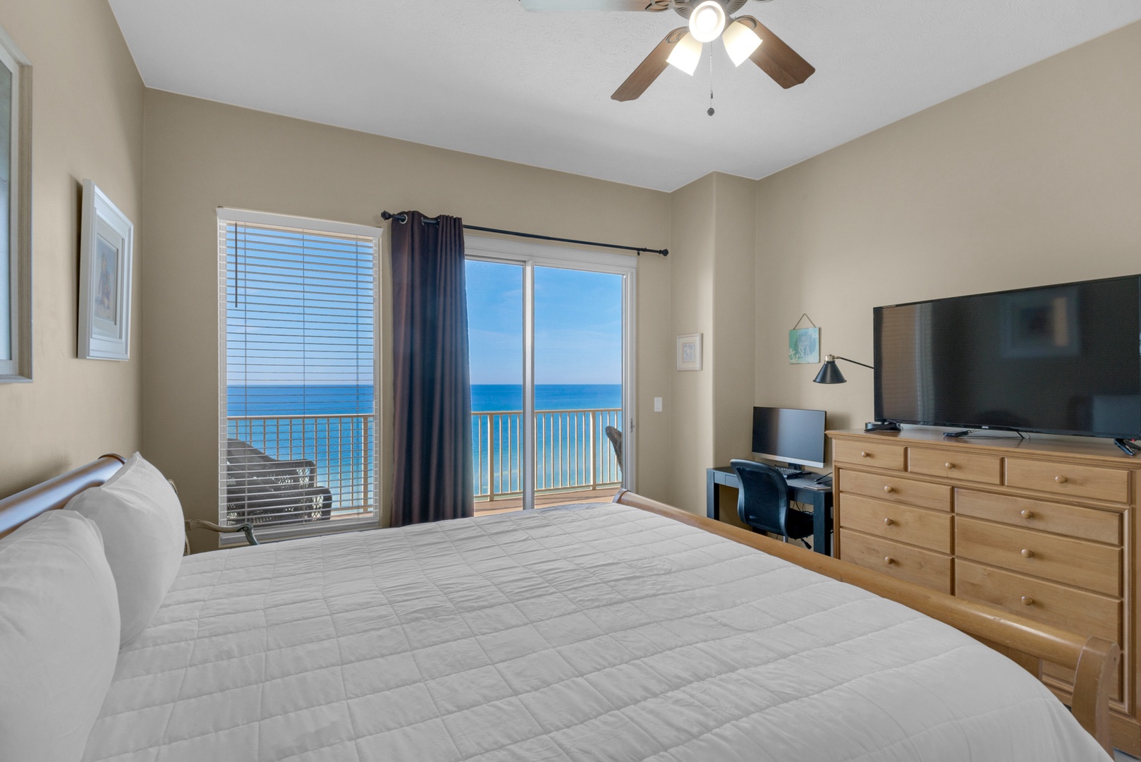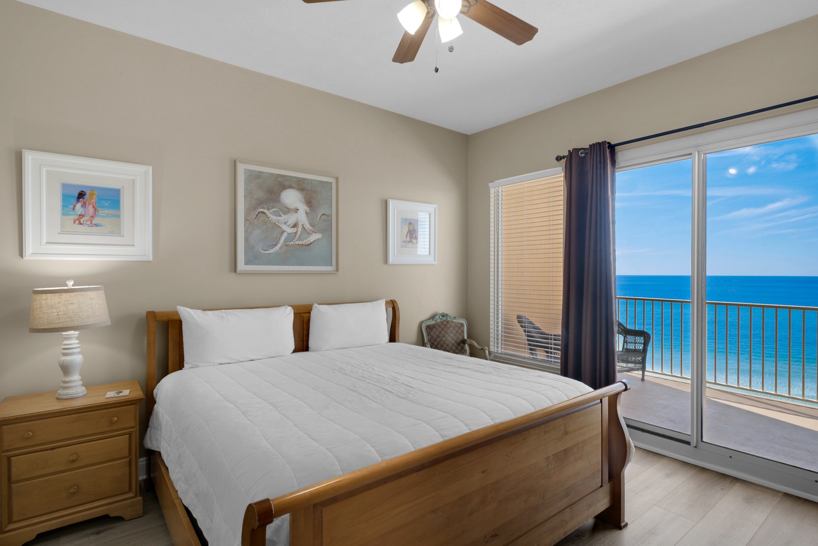 • Gulf front main king bedroom steps out to oversized balcony; private ensuite bathroom and walk-in closet