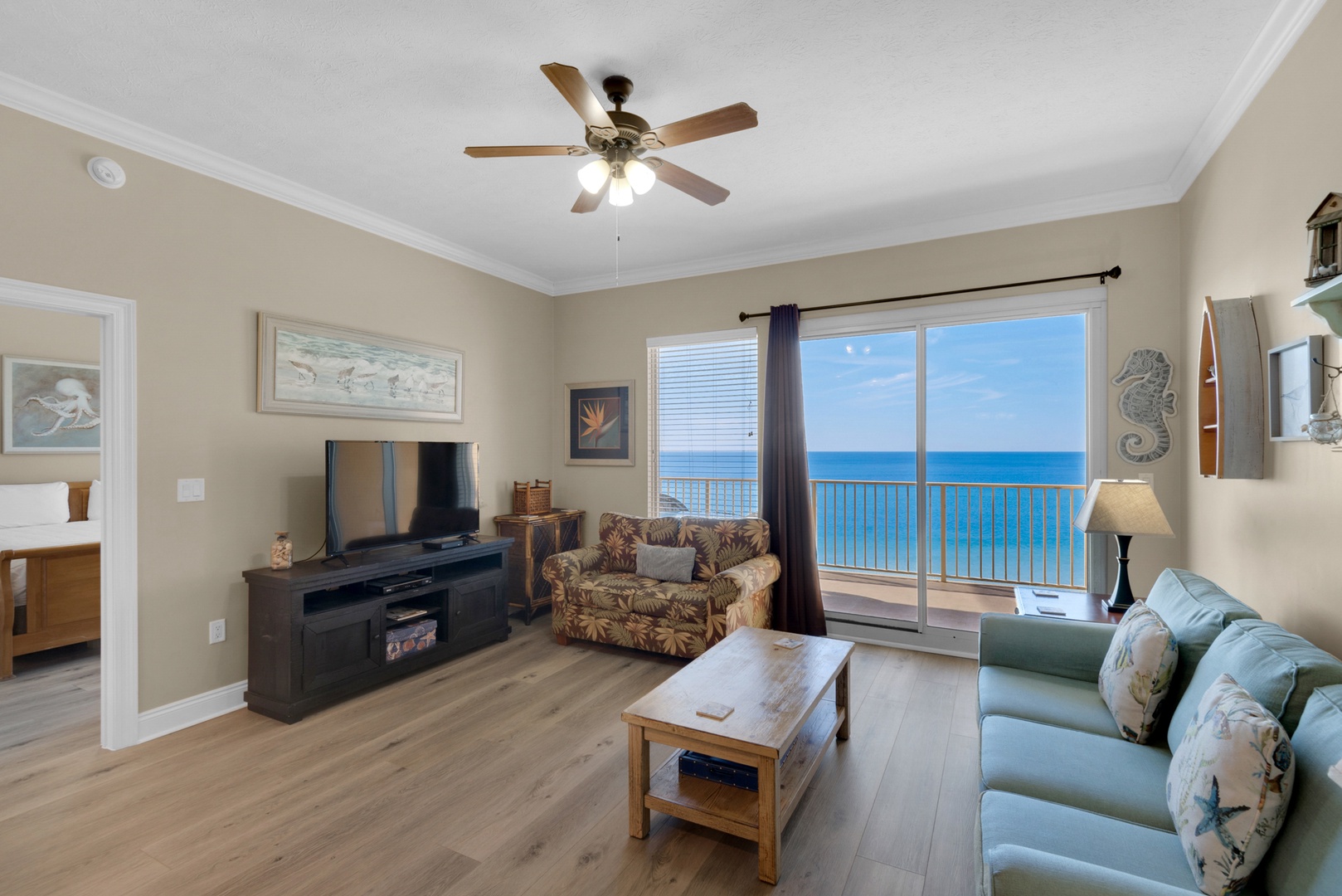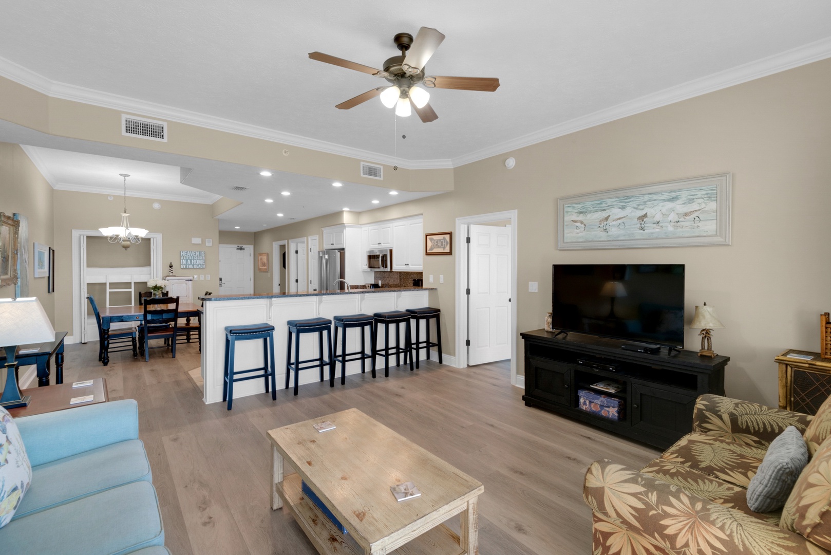Located on the fifth floor of Treasure Island Resort, the unit features floor-to-ceiling windows providing a view of the Gulf and filling the space with natural light. The living area has an open concept design.