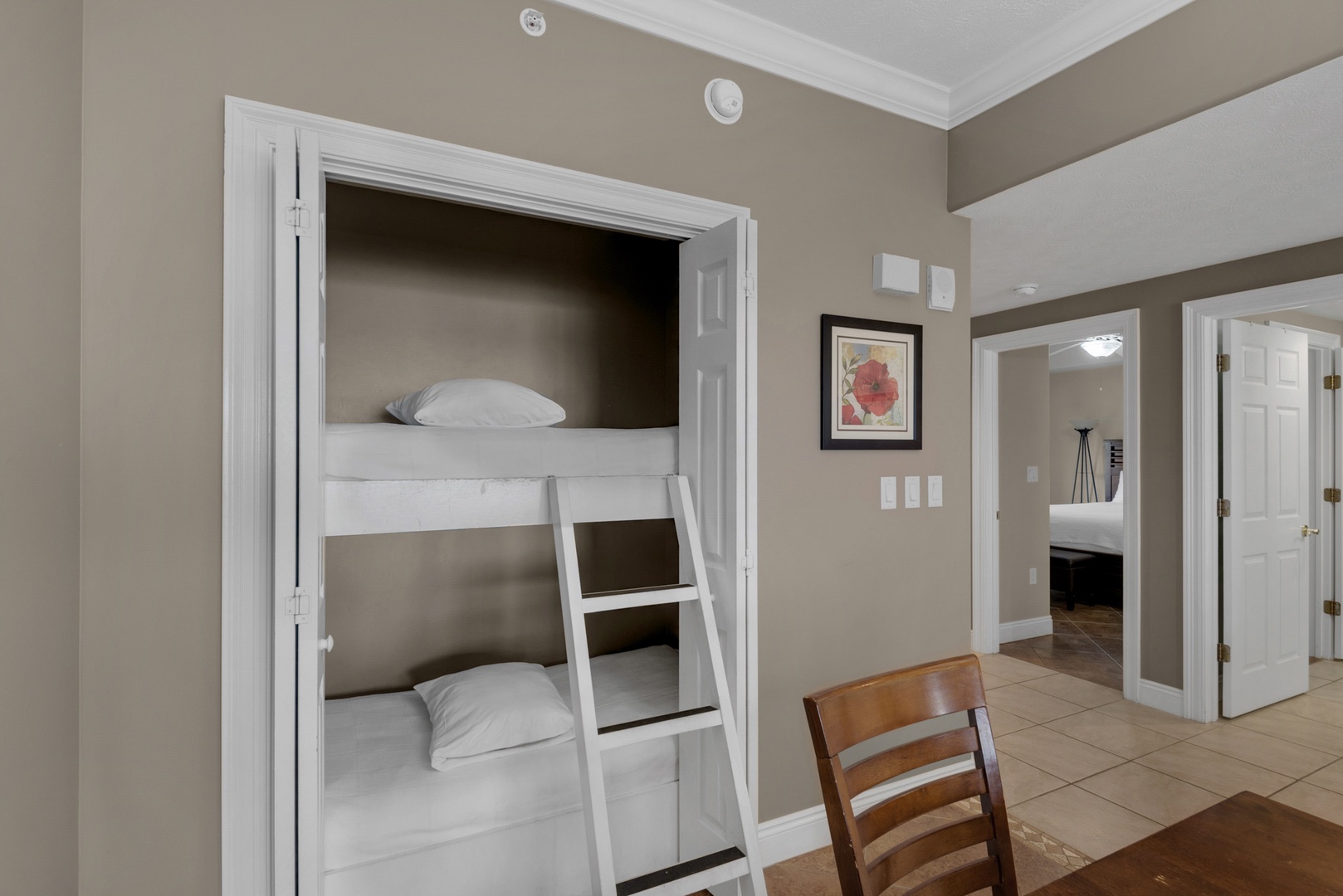 It’s a 1,370 sq. ft. space with 2 bedrooms, 2 baths, and bunk beds – sleeping six comfortably. The main bedroom features balcony access, a king-sized bed, ensuite bathroom and walk-in closet. The second bedroom has a queen-sized bed. There are clever bunkies off the dining area that each are single mattresses. Bunkies are a popular choice for kids and teens.