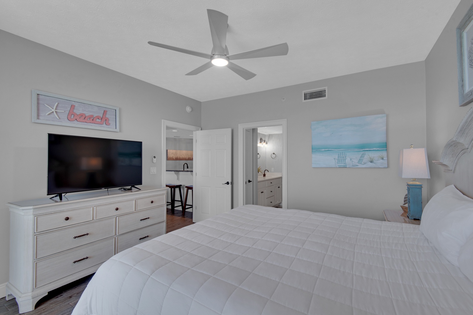 • Gulf front main king bedroom steps out to oversized balcony; private ensuite bathroom and walk-in closet