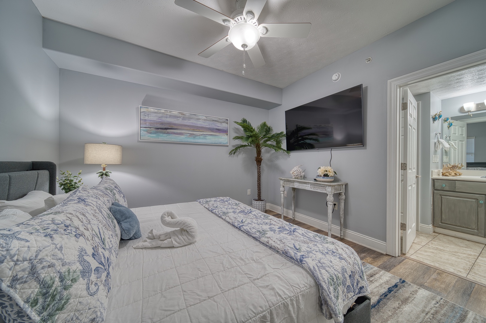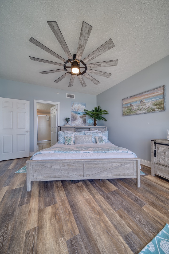 • Gulf front main bedroom with king bed steps out to oversized balcony; private ensuite bathroom and walk-in closet