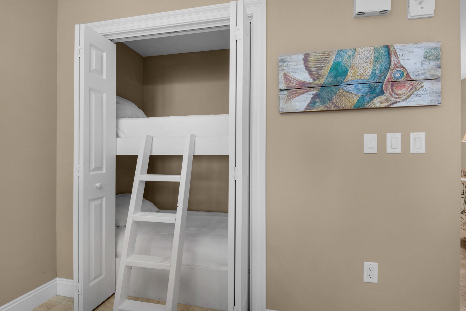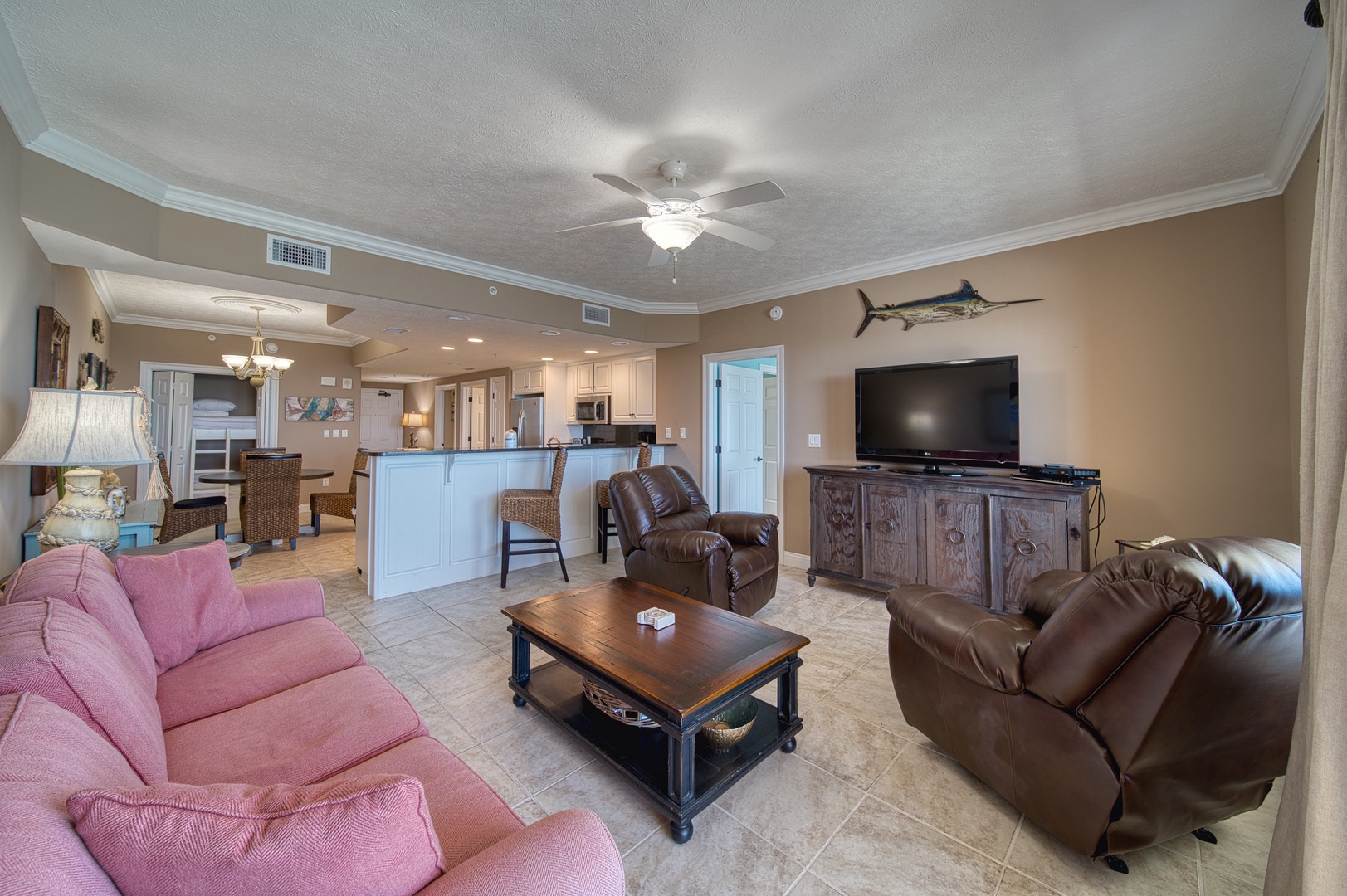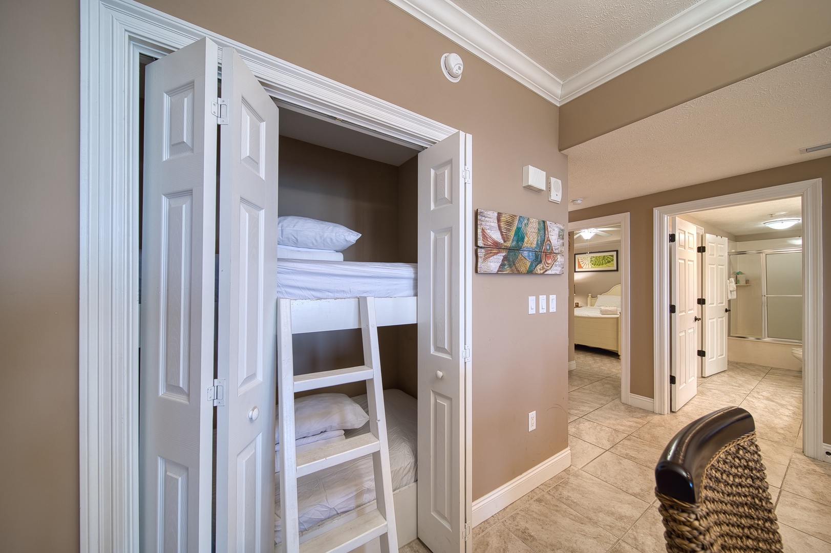 Perfect for up to eight guests, the primary bedroom has balcony access, a king-sized bed, ensuite bathroom and walk-in closet, a second bedroom with a queen-sized bed, a guest bath, and a fun twin-over-twin bunk area for the kids or extra friends, sofa sleeper in living area.
