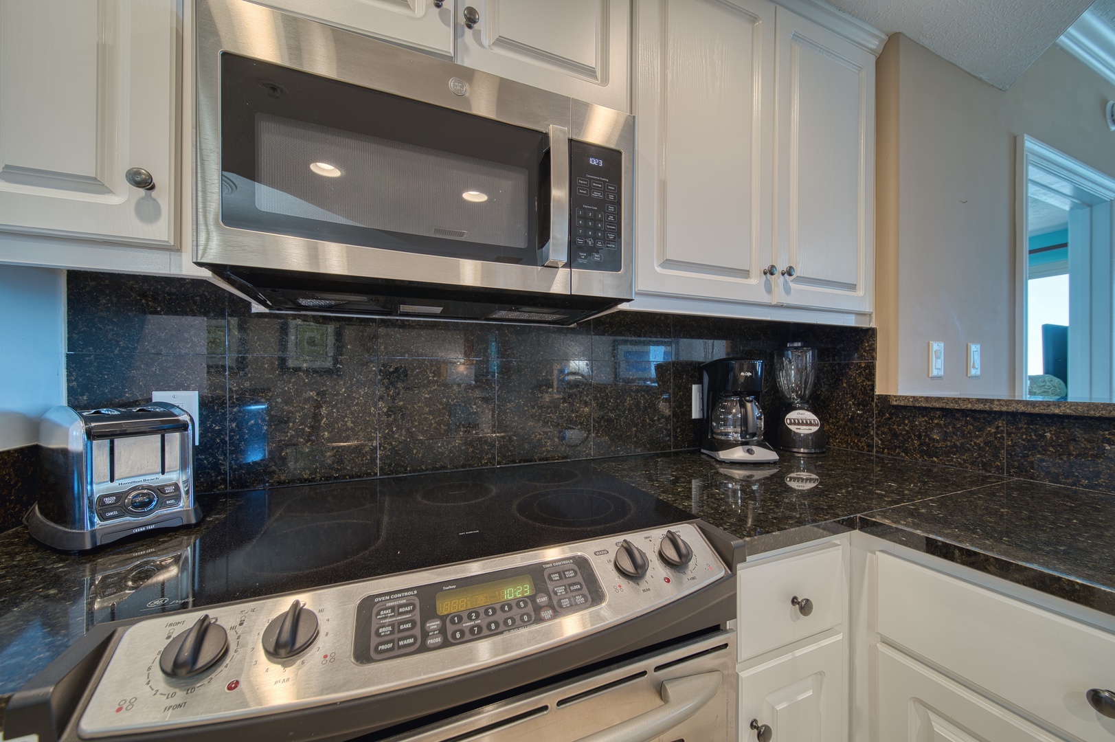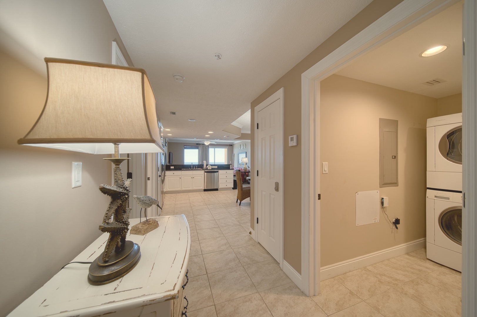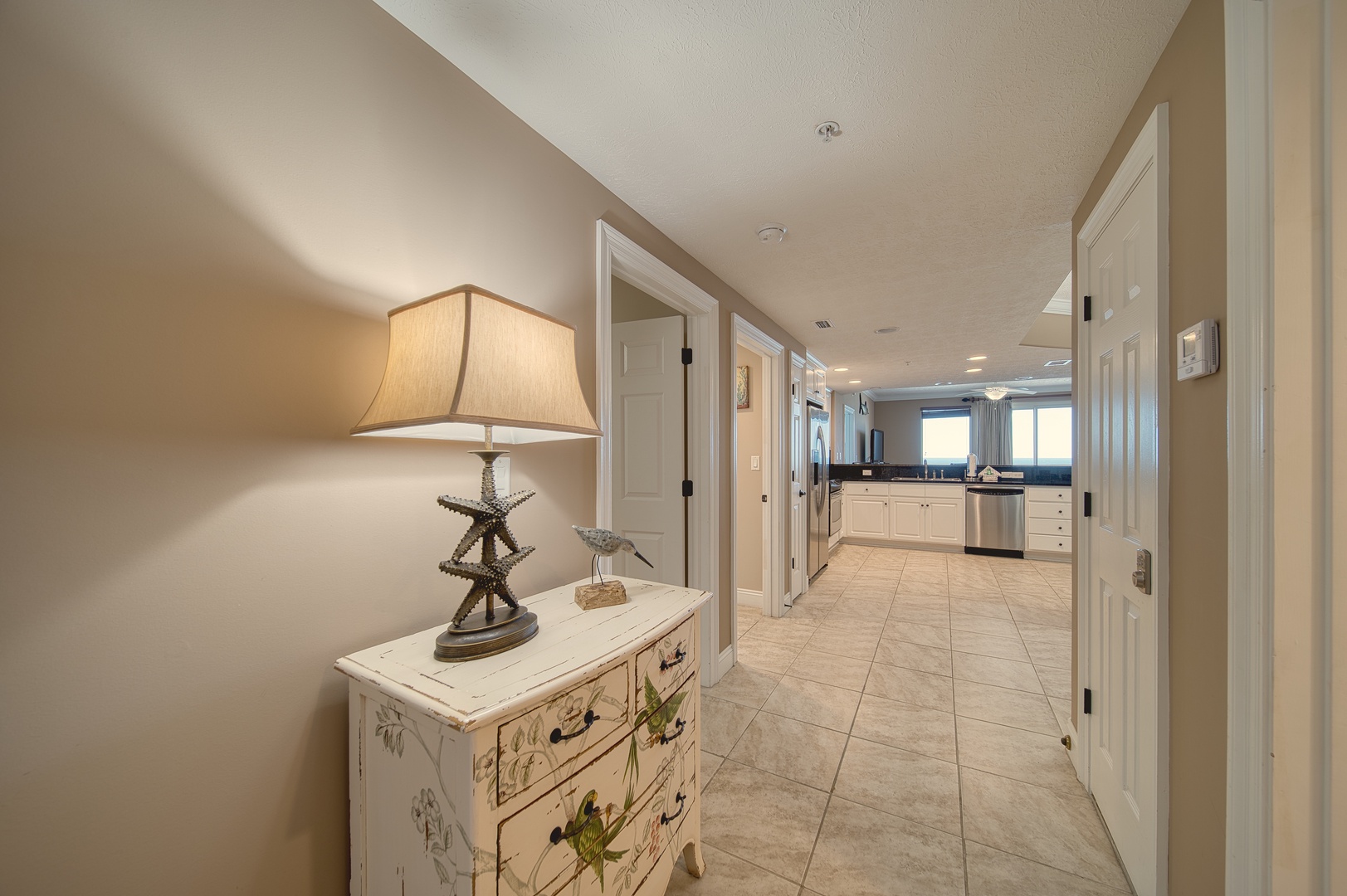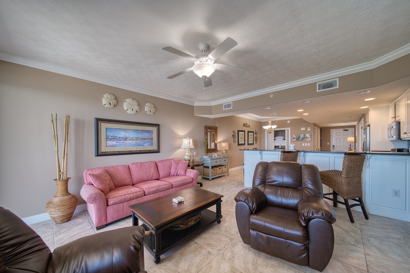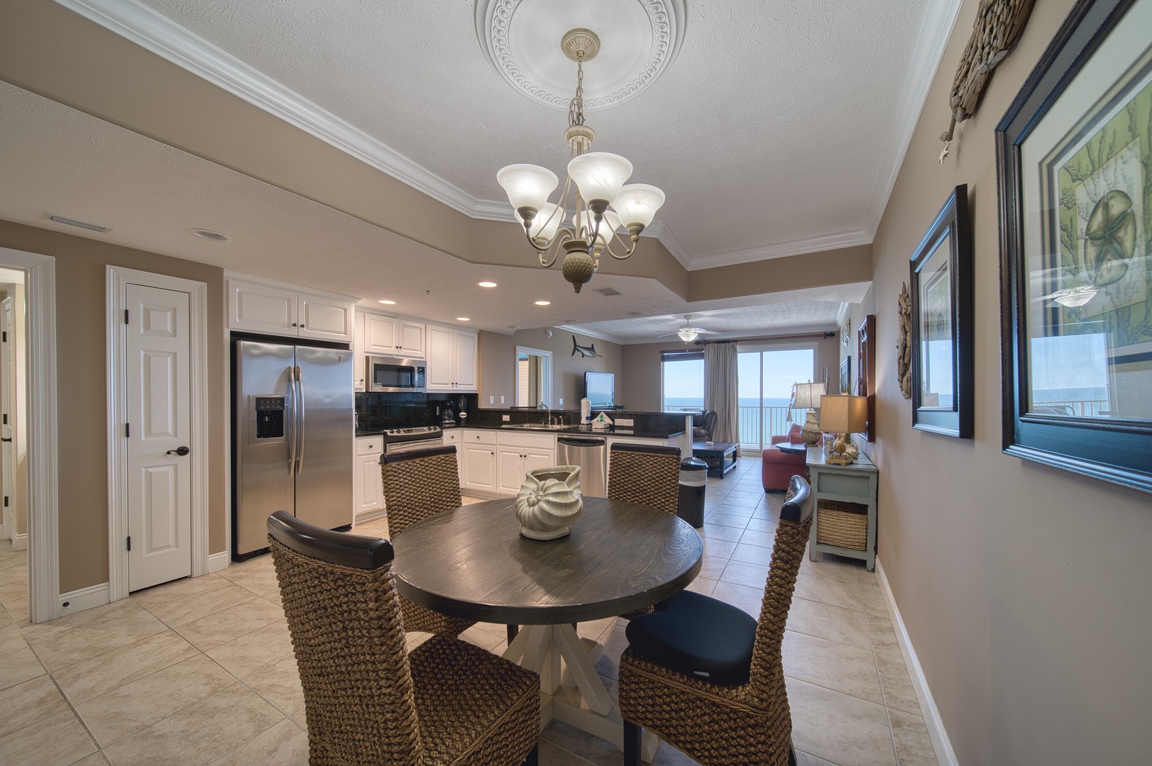 This condo embraces the beach and marine life in its thematic and spirited decor. The open floorplan welcomes in the gulf views from the main living space and the primary bedroom and ensuite bathroom. The kitchen is equipped with modern stainless appliances and everything you need for your stay.