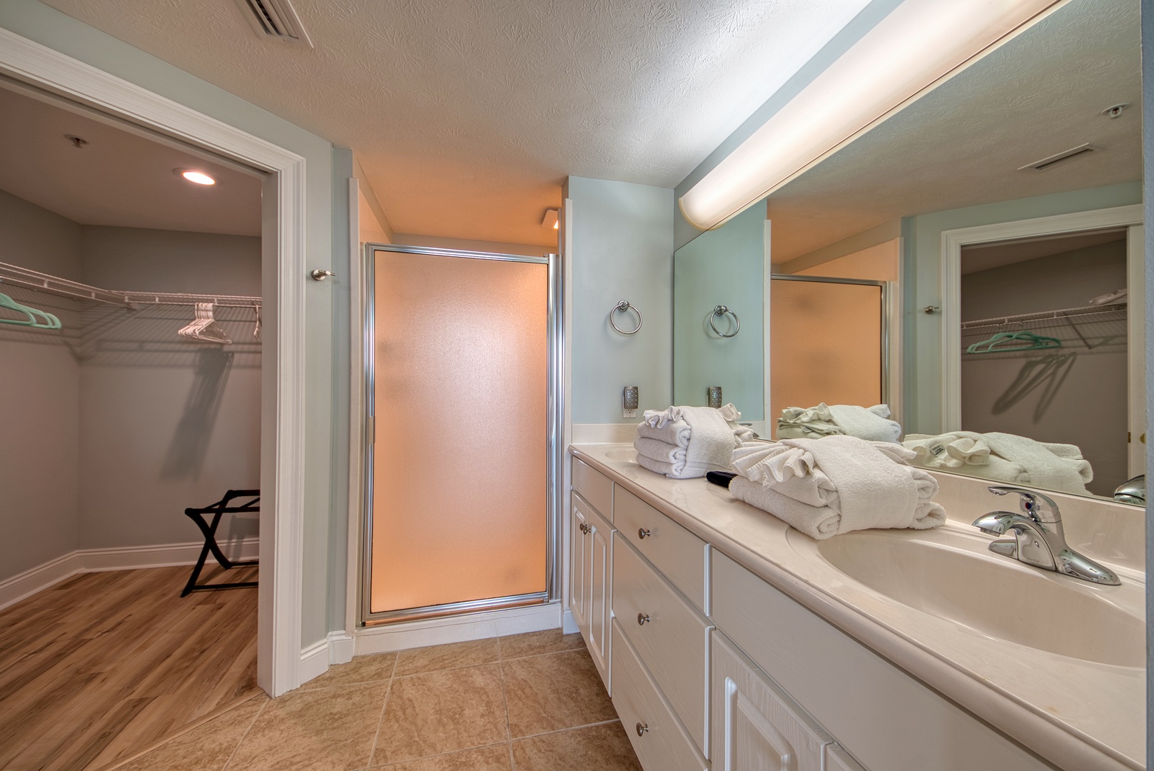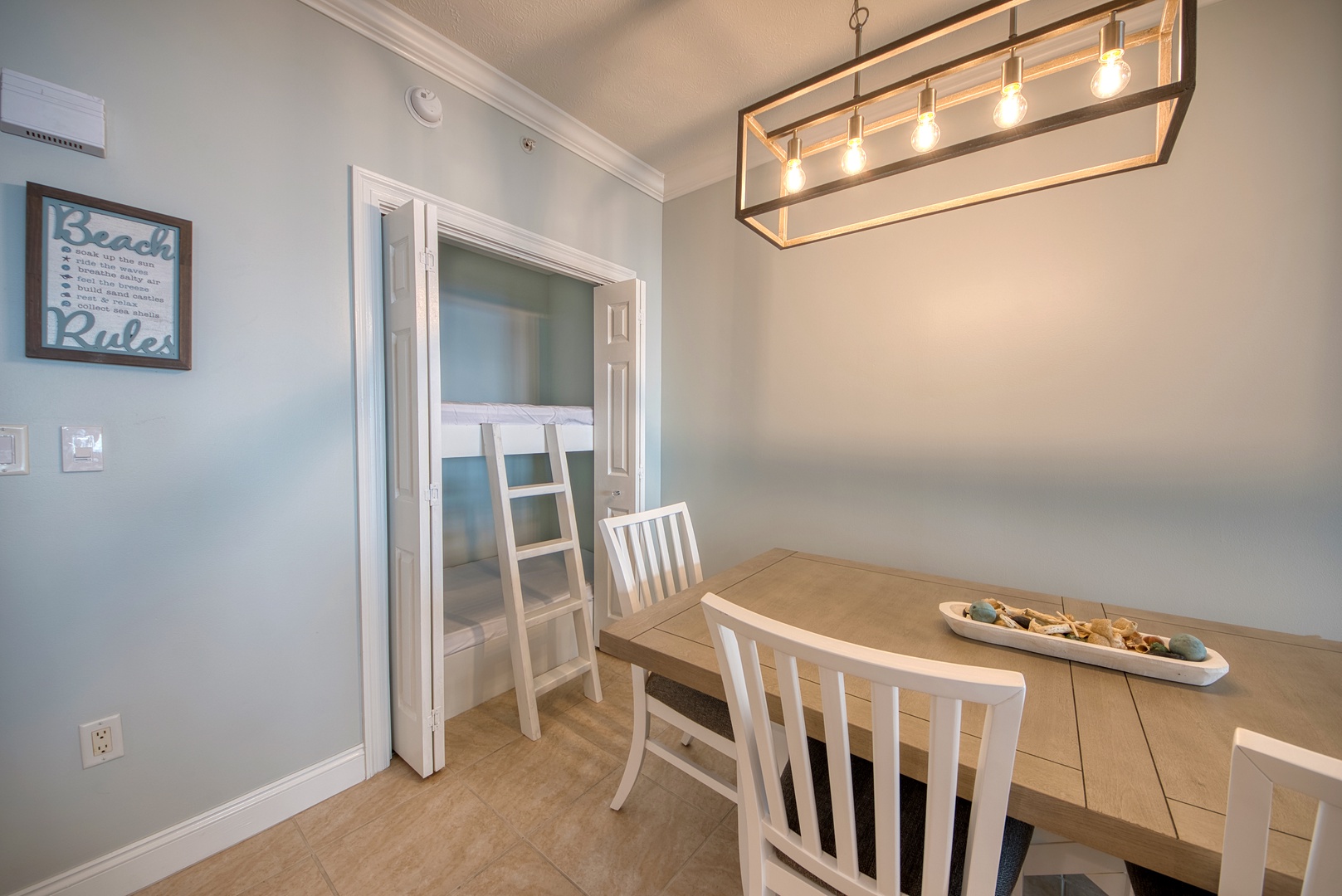 It’s a 1,370 sq. ft. space with 2 bedrooms, 2 baths, bunk beds and sleeper sofa – sleeping eight comfortably. The main bedroom features a king-sized bed, balcony access, ensuite bathroom and walk-in closet. The second bedroom also has a king-sized bed. There are clever bunkies off the dining area that each are single mattresses. Bunkies are a popular choice for kids and teens. Plus, a sleeper sofa is in the living area.
